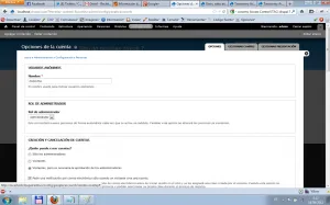 A través de la configuración global del sitio web, podremos configurar opciones para la gestión de los usuarios, sobre todo orientados a configuraciones por defecto y opciones permitidas en el sitio. Para acceder a esta parte de la configuración a través de la barra de tareas pulsamos en el enlace “Configuración” y luego pulsamos en “Opciones de la cuenta”, aparecerá un formulario similar al siguiente…