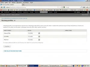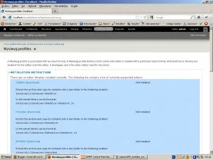De esta manera podemos ver que no hay ningún editor wysiwyg instalado en el drupal, así que deberemos descargarlo e instalarlo manualmente, según nos indican los textos. Inicialmente nos decantaremos por descarga e instalar el CKEditor. Lo descargarmos desde la url: http://ckeditor.com/download exactamente la útlima versión disponible, en el momento de la redacción de esta entrega es la siguiente: http://download.cksource.com/CKEditor/CKEditor/CKEditor%203.6.3/ckeditor_3.6.3.zip antes de nada debemos generar un directorio llamado “libraries” dentro del directorio “sites/all” dentro de la instalación de drupal. entonces desacargamos el fichero del CKEditor. Una vez descargado, descomprimimos el fichero directamente dentro del directorio “sites/all/libraries”, por lo que deberíamos disponer de un directorio llamado “ckeditor” dentro de la carpeta “sites/all/libraries”. Una vez copiada la carpeta a su sitio, volvemos a entrar en la configuración de Wysiwyg y nos encontraremos con un formulario similar al siguiente…