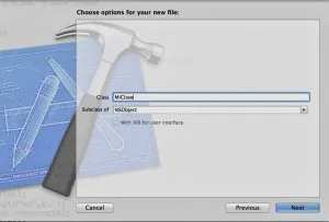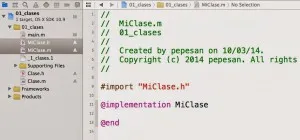 También podemos ver cómo en la parte izquierda tenemos dos ficheros correspondientes a la nueva clase. El fichero .h o de cabecera (sí como en C) y el fichero .m de implementación. Como derivado de C disponemos de los dos ficheros, uno para las definiciones y otro para la implementación.