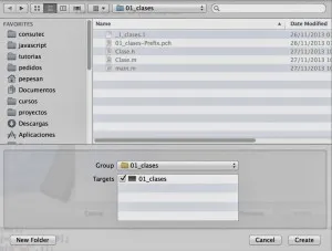 Seleccionaremos la carpeta donde se guardará la clase en la parte superior y en la inferior indicaremos el grupo, que es la manera que tiene de denominar Xcode las carpetas virtuales dentro del proyecto. Dentro de la carpeta del proyecto tenemos una carpeta con ese mismo nombre. y es donde se situará los ficheros de la clase.