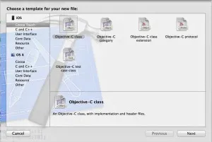 Empecemos por dar de alta una clase en Xcode en un proyecto cualquiera. Para ello deberemos pulsar Comando + N para un crear un nuevo fichero, a continuación aparecerá el siguiente diálogo: