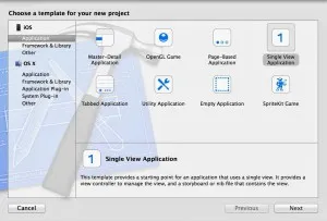 Pulsaremos en la opción “Create a new Xcode project” nos saldrá la pantalla de selección de tipo de proyecto: