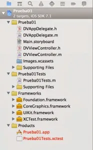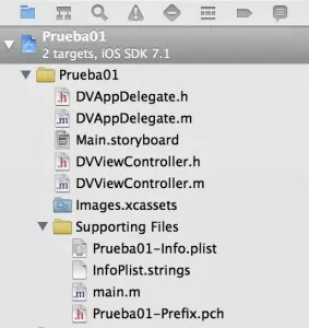 Una vez teniendo claro como movernos por el entorno debemos explicar brevemente la estructura de un proyecto iOS7. En el gestor del proyecto tendremos lo siguiente si has seguido la guía: