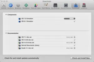 Normalmente cuando nos descargamos el Xcode ya nos descarga también los frameworks de desarrollo o SDK’s para iOS y MacOSX. Podemos ver esta información a través de las preferencias del Xcode. Desde el menú Xcode->Preferencias y dentro de la pestaña de Download podemos ver lo siguiente: