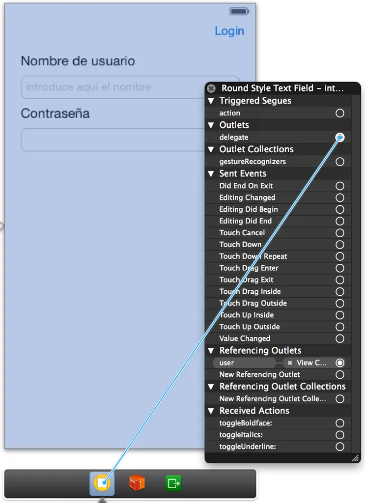 Primero deberemos hacer que los dos delegate de los campos apunten a la clase View Controller que maneja el formulario. Para ello tendremos que seguir unos breves pasos que tendremos que repetir para cada campo.