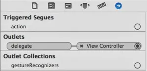 Como se ve en la captura luego debemos conectar el delegate con el View Controller de la escena arrastrando y soltando sobre el icono del View Controller al soltar debería estar conectado correctamente, con el campo seleccionado,al ir al inspector de conexiones veríamos lo siguiente: