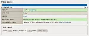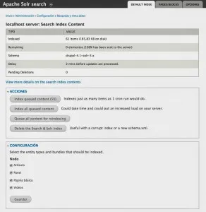 - Vista con el resumen del índice, desde ahí podemos mandar reindexar el contenido.