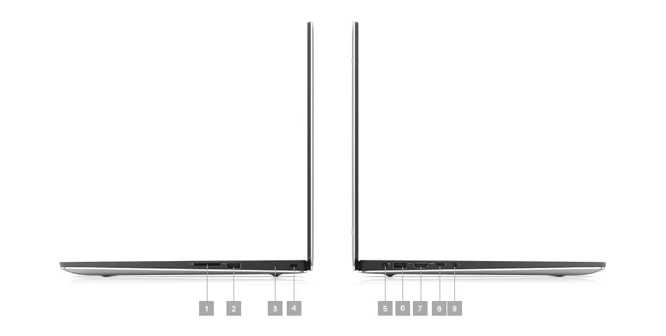 Lector de tarjetas de memoria | 2. Puerto USB 3.1 Gen 1 | 3. Botón de estado de la batería | 4. Candado de seguridad | 5. Puerto para adaptador de corriente | 6. Puerto USB 3.1 Gen 1 | 7. HDMI 2.0 | 8. Thunderbolt 3 | 9. Conector para auriculares