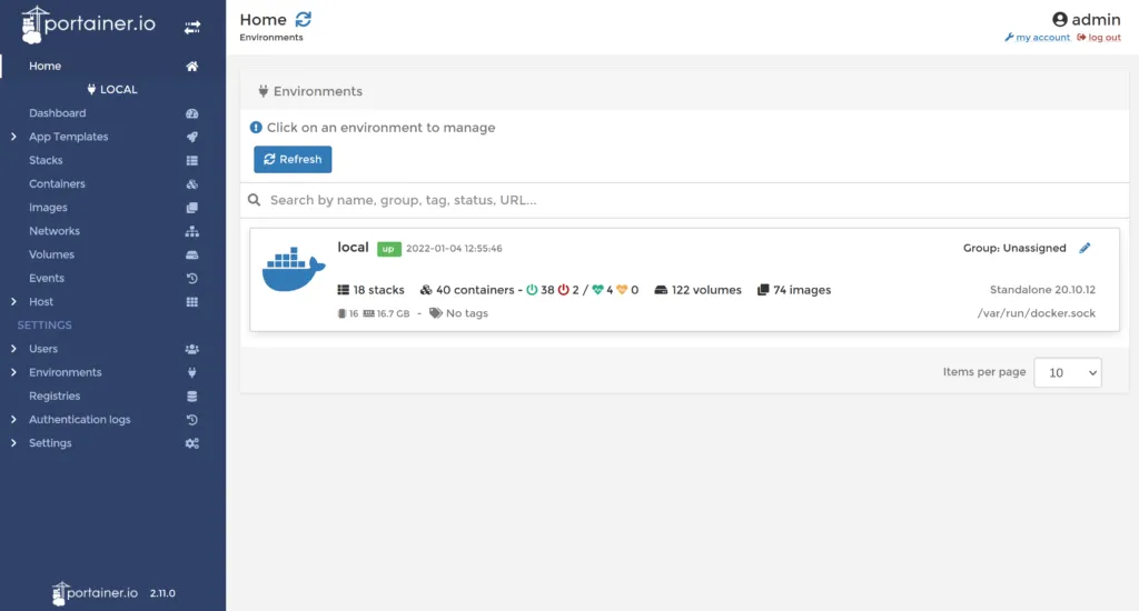 pantalla principal de portainer