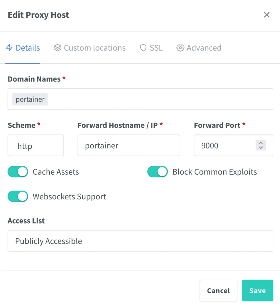Elegimos el esquema http, en el forward hostname/ip podemos poner o el nombre del contenedor de portainer o la ip que tenga ese contenedor dentro de la red de NPM, e indicamos el puerto de acceso.