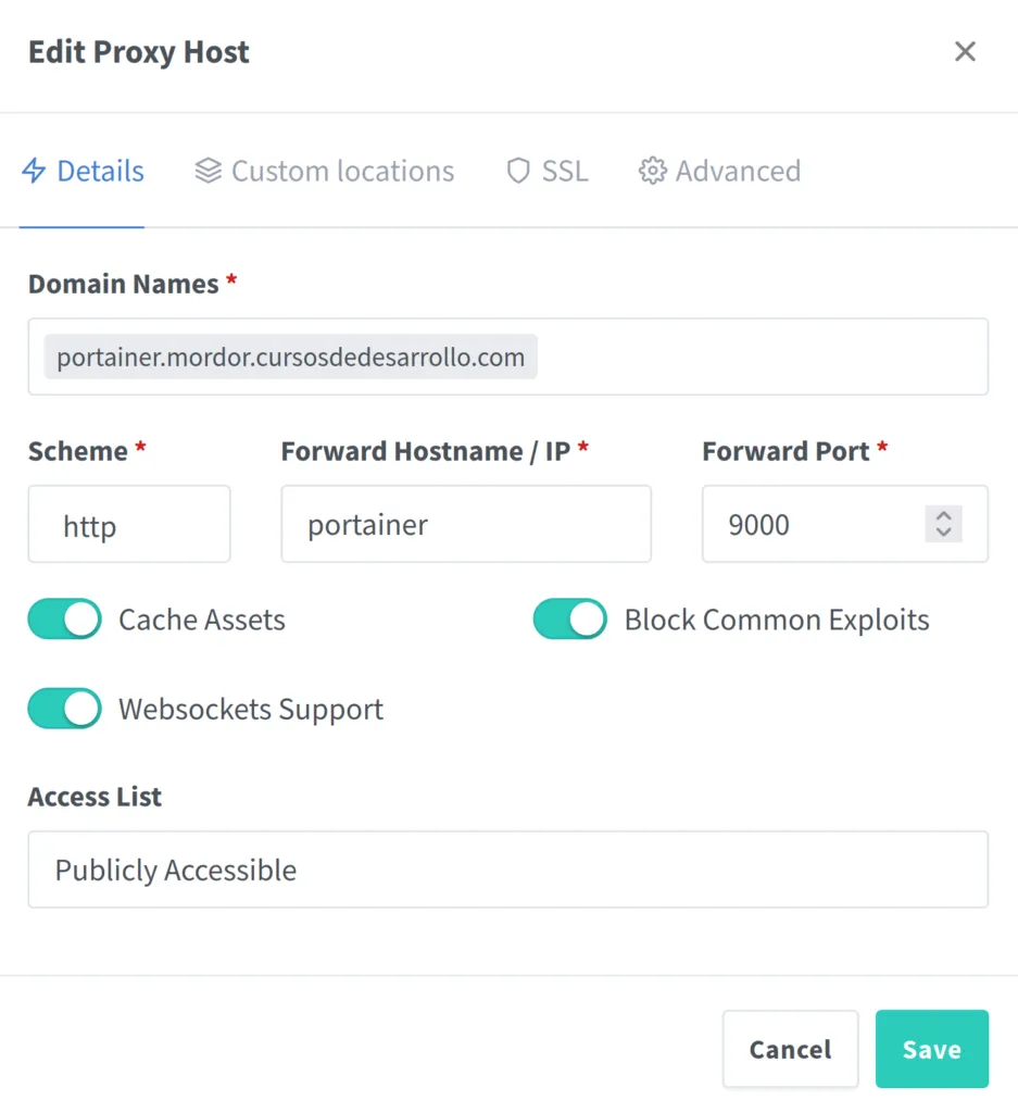 Para ello deberemos configurar dos proxy host, uno para el uso interno y otro para el externo.