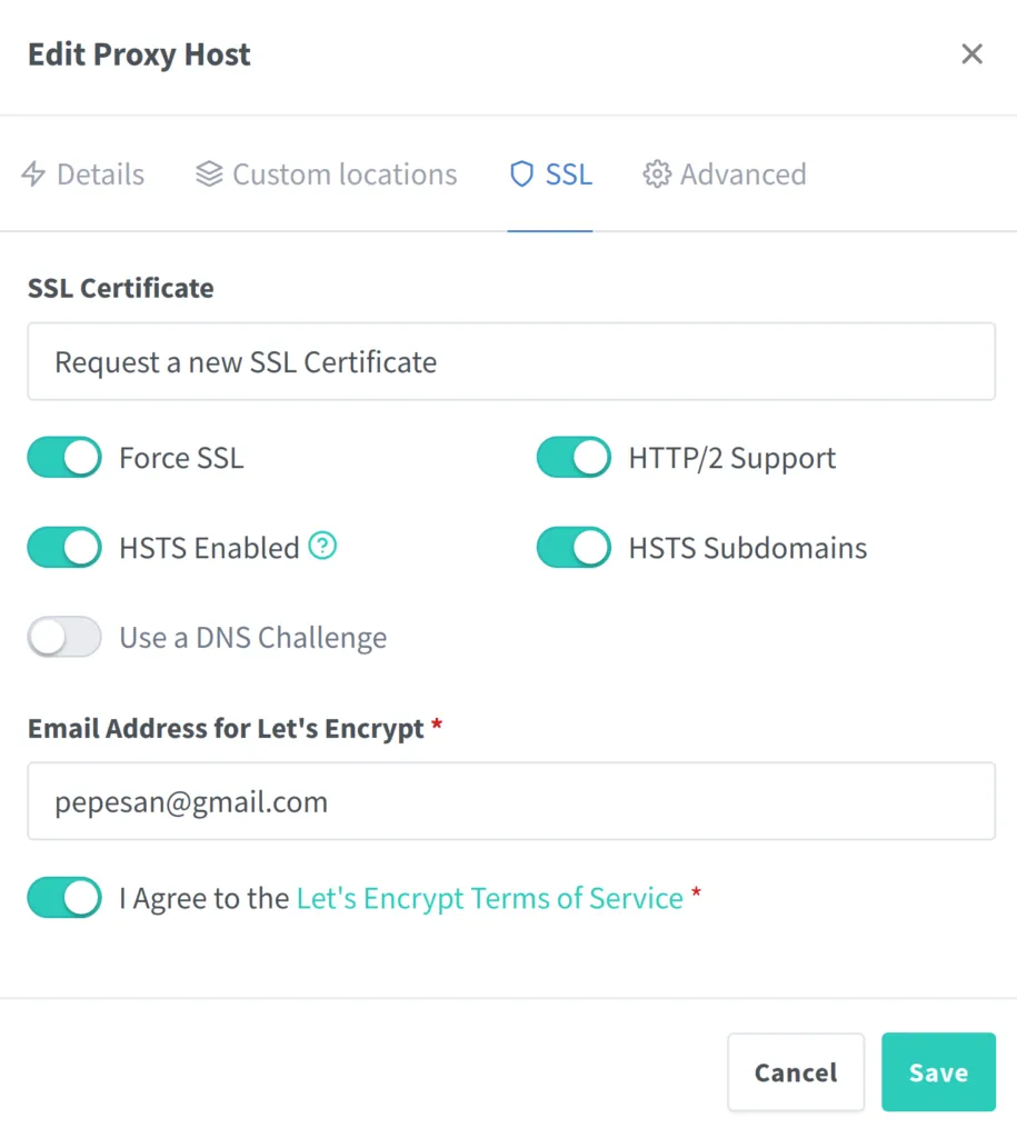 Conviene recordar que el despleguable del certificado SSL seleccionaremos “Request new certificate with letsencrypt” para que cuando lo guarde pida a letsencrypt que genere el certificado SSL para ese dominio. Si tuviéramos otro certificado anterior podríamos seleccionarlo. Pero en nuestro caso pondremos el correo de registro en letsencrypt y aceptaremos los términos de uso.