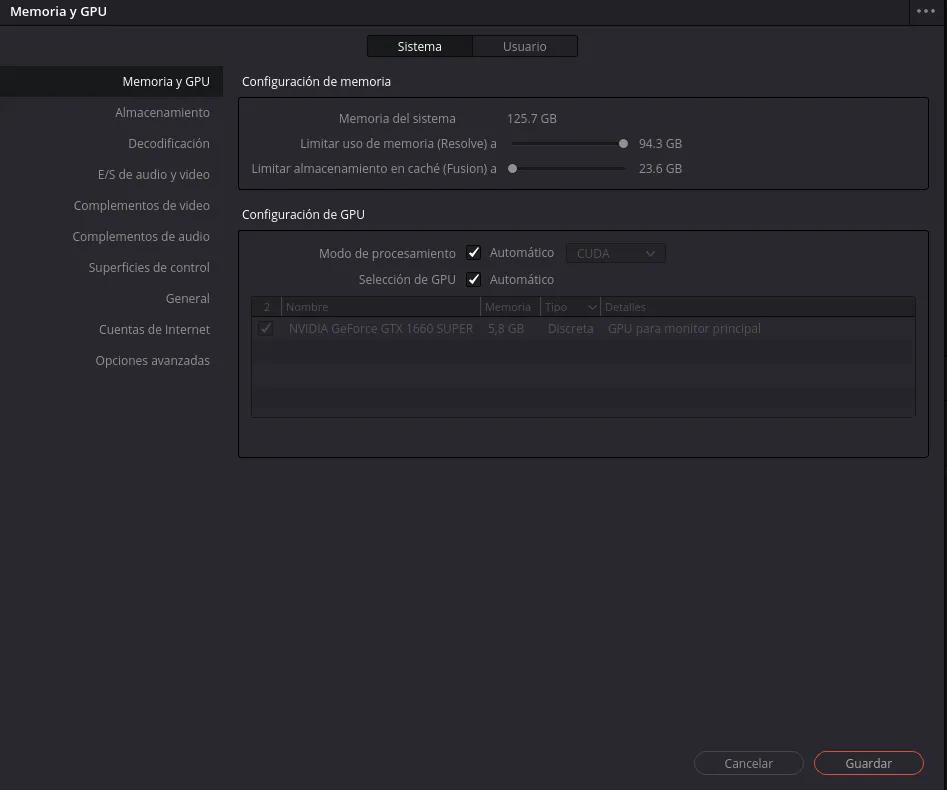 Preferencias del Sistema GPU