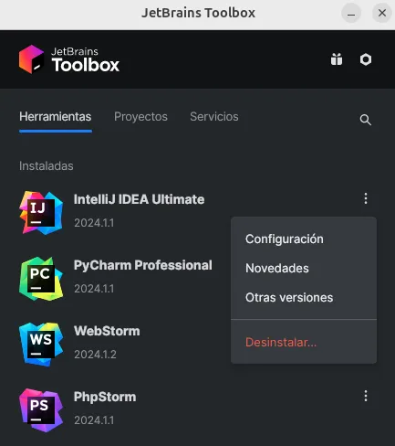 Si queremos arreglar esto y no tenemos instalada y arrancada la aplicación Jetbrains ToolBox deberemos irnos a la carpeta .config/JetBrains/ dentro de nuestro perfil de usuario en nuestro sistema operativo, en el caso de Linux /home/usuario