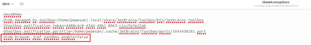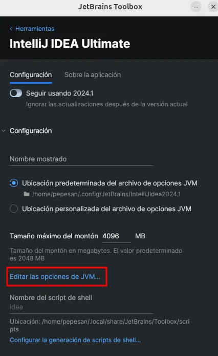 Si lo pulsamos debería abrirnos un editor de texto en el fichero de configuración de las opciones de JVM para esa aplicación que debería estar en: ~/.config/JetBrains/
