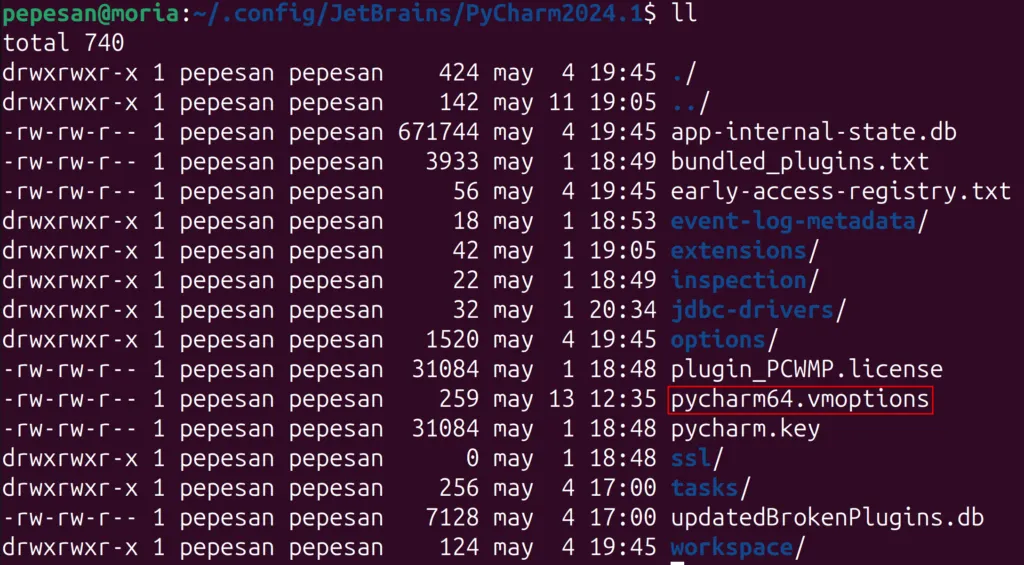 Como el producto es pycharm el fichero que nos interesará será el pycharm64.vmoptions
