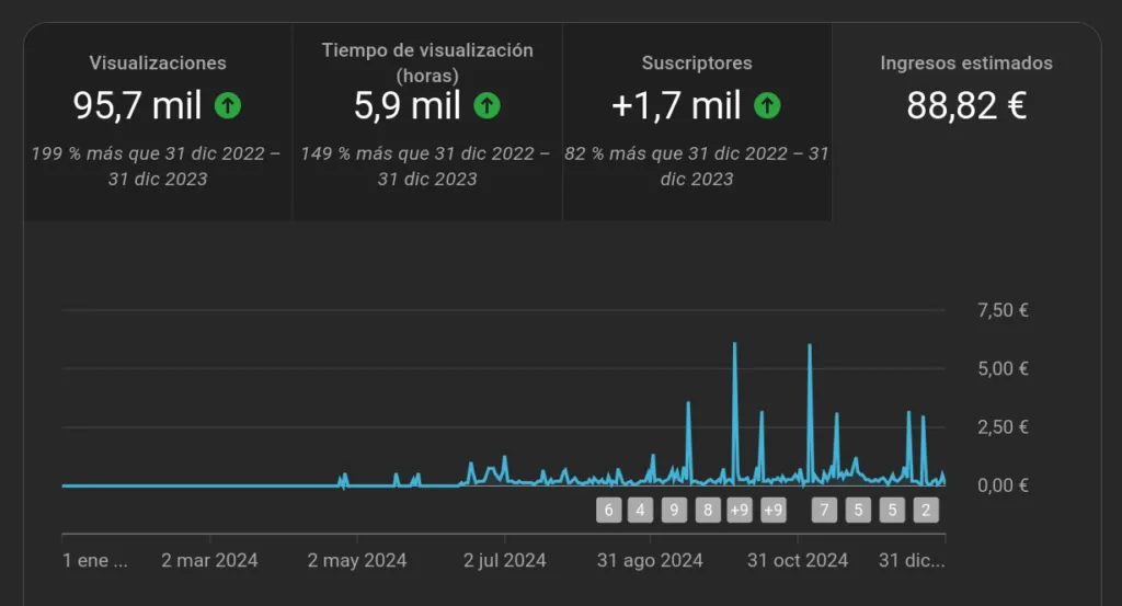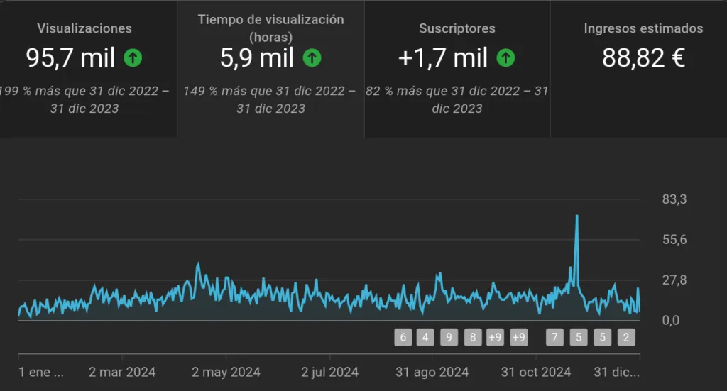 Este año 2024 hemos conseguido acumular unos ingresos de 88,82€ totales, pero como Youtube sólo factura a partir de acumular 70€ la primera factura ha sido con lo acumulado desde comienzo del partner hasta finales de noviembre que es cuando pudimos sobrepasar los 70€ y ya nos emitieron el primer pago a finales de diciembre. Que ha sido alrededor de de 76 € .