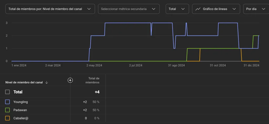 Esto significa que cuando empiezas lo primero que eres capaz de generar son miembros de canal, esto se nos activó en Mayo de 2024 por lo que eran prácticamente los únicos ingresos que podíamos tener, junto con los Super gracias, y la tienda.