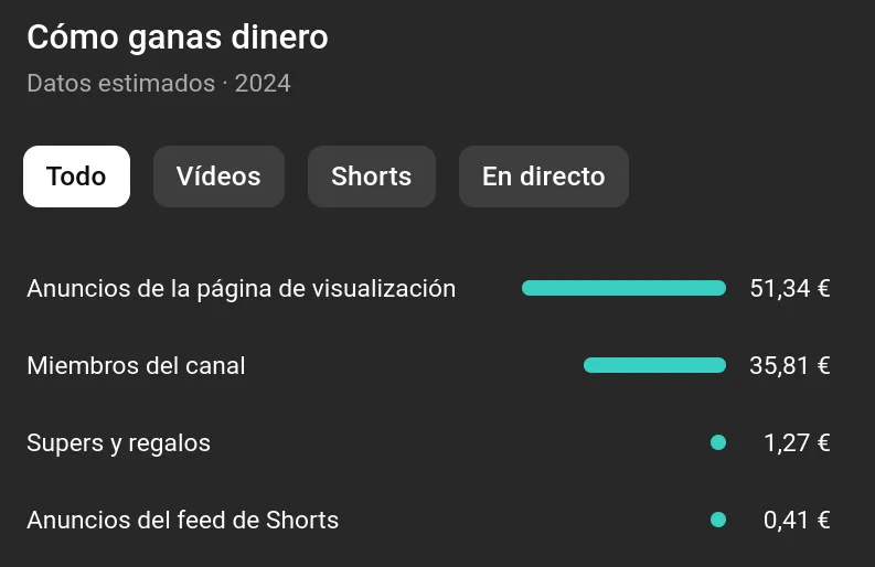 Como vemos el ingreso principal es el de los anuncios de Youtube, seguido cerca por los miembros del canal, el uso de los super es anecdótico y lo de los anuncios de los vídeos cortos directamente no merece la pena ni mencionarlo.