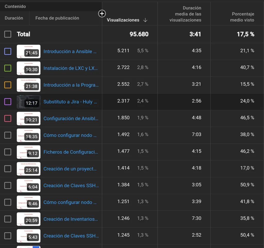 Cómo vemos en las estadística gran parte del contenido del canal más visto ha sido la serie sobre Ansible, creemos que es porque es de lo únicos contenidos en castellano de la herramienta que la cubran de manera completa en un curso gratuito.